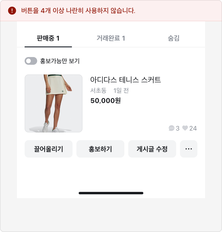 여러 개를 나란히 배치하면 각 버튼의 중요도가 비슷해 보여 사용자가 선택하기 어렵고, 클릭 유도 효과가 감소합니다. 또한 폰트 스케일링으로 큰 텍스트를 사용하는 경우 라벨이 잘릴 수 있습니다.